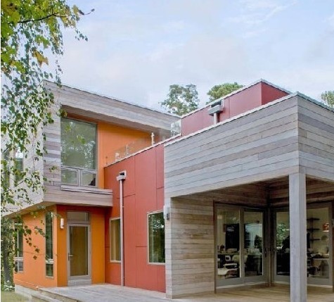 美国环保系统汇聚的节能住宅,位于美国马萨诸塞州的奥尔良市,其外立面是亮桔色。房屋中装有许多环保的系统,屋外有宽敞的户外空间,屋顶上种有花草植物,这些植物可以为房屋起到隔离的作用。