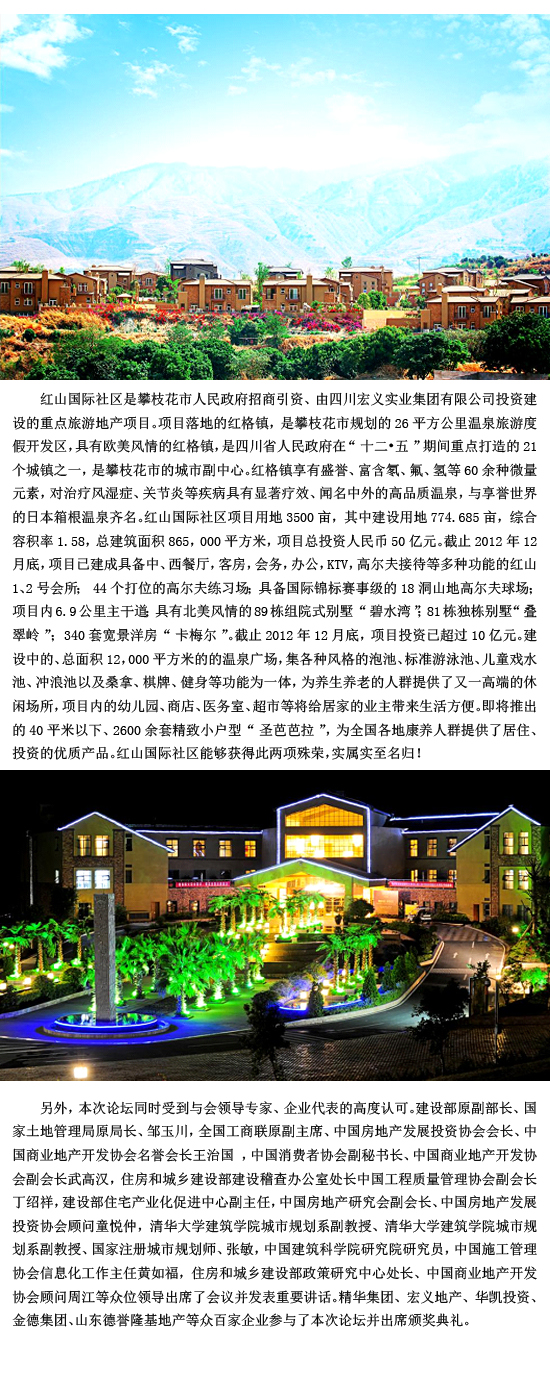2013年5月19日,由宜居网、中国房地产发展投资协会、中国商业地产开发协会、宜居网、亚洲国际住宅发展协会联合主办的2013中国房地产“新格局”论坛在北京京西宾馆隆重举行,搜房网、新浪乐居、搜狐焦点、宜居网等各大媒体的纷纷到达现场进行了全面报道,在本次论坛中,“2013中国好楼盘”颁奖盛典尤为受到关注,红山国际社区以其卓越的优势斩获“2013国际最佳生态养老地产项目大奖”和“2013中国房地产人居环境最佳范例金奖”。