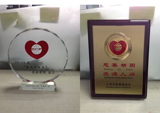 2009年11月荣获上海慈善基金会颁发的捐赠叁万人民币用于放飞希望专项基金的捐赠证书。