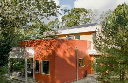 美国环保系统汇聚的节能住宅,位于美国马萨诸塞州的奥尔良市,其外立面是亮桔色。房屋中装有许多环保的系统,屋外有宽敞的户外空间,屋顶上种有花草植物,这些植物可以为房屋起到隔离的作用。