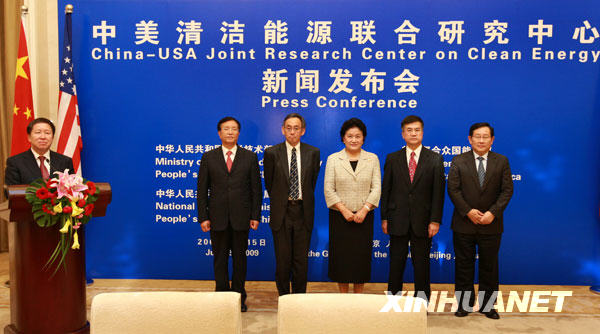 7月15日,中国科技部、国家能源局和美国能源部在北京人民大会堂共同举行新闻发布会,国务委员刘延东出席发布会。科技部部长万钢(右一)、国家能源局局长张国宝(右五)和美国能源部长朱棣文(右四)共同宣布成立中美清洁能源联合研究中心。美国商务部长骆家辉(右二)和科技部副部长曹健林(左一)出席。新华社记者 庞兴雷 摄