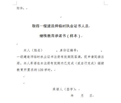 二、在新的建造师继续教育政策出台前,已完成一级建造师临时执业证书延续注册的人员,再次申请延续注册时,可暂不提供达到继续教育要求的证明材料,只须提供在本注册有效期内已完成继续教育不少于120学时的书面承诺(样本附后)。